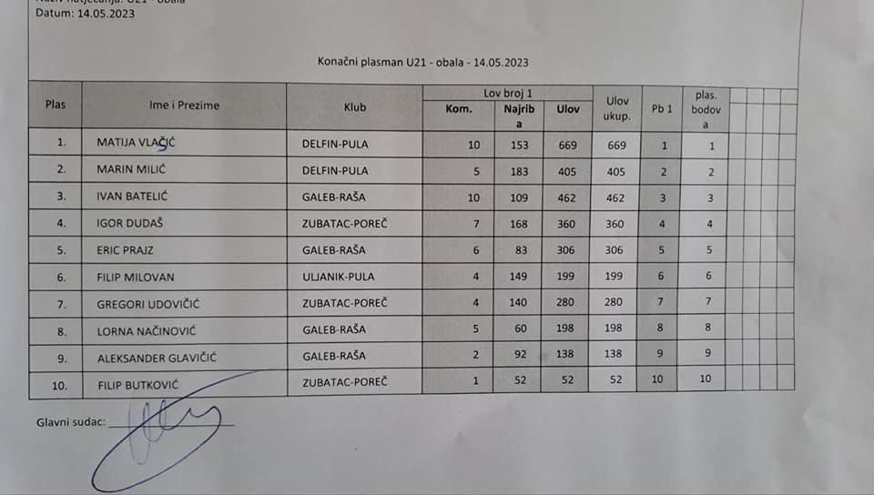 Na danas održanom Županijskom prvenstvu u sportskom ribolovu u kategoriji U21 štapom sa obale, naša ekipa u sastavu MATIJA VLAŠIĆ I MARIN MILIĆ apsolutno je dominirala. Matija je bio prvi, a Marin drugi u pojedinačnoj konkurenciji i kao takvi pobijedili su i ekipno. Iako je kiša padala cijelo drugo poluvrijeme, Matijin pobjednički ulov vagao je 669 g ribe, dok je Marin u 405 g imao i naj ribu lumbraka od 183 g. Ovim uspjehom plasirali su se na Međužupanijsko prvenstvo koje ih očekuje u rujnu. Današnji domaćin bio je ŠRD Zubatac Poreč, a natjecanje se održalo po principu ”ulovi i pusti”. Rezultati su se mogli odmah po vaganju pratiti direktno na web stranici Hrvatskog ribolovnog saveza: hssrm-natjecanja.hr.
